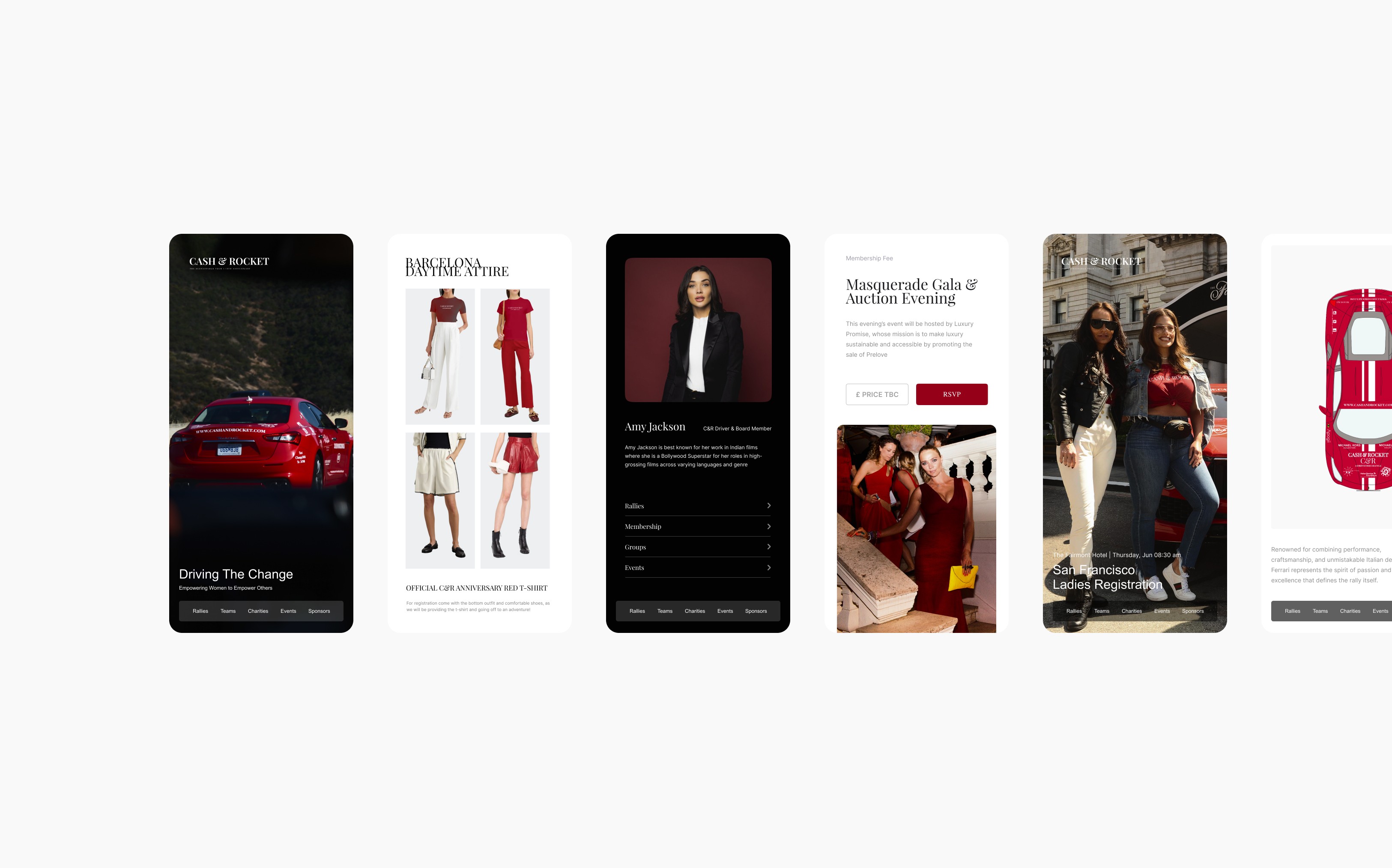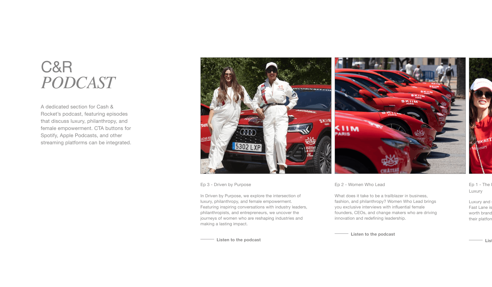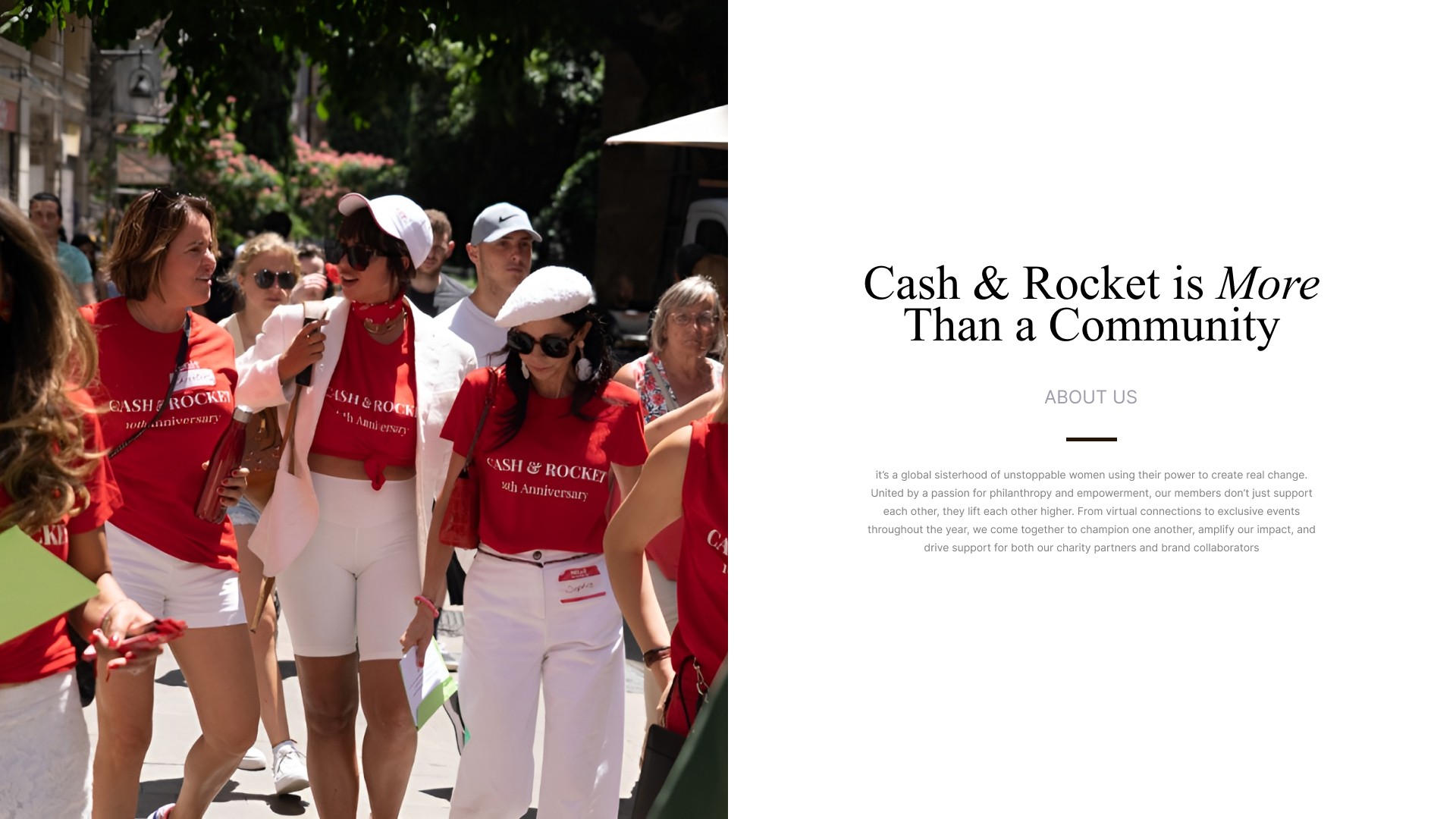 Cash & Rocket is one of the most compelling philanthropic networks in the world — 80 women, 40 red sports cars, four cities, and a singular mission: to drive real change for women everywhere. Our challenge was to give that force a visual identity and digital presence worthy of what it represents.