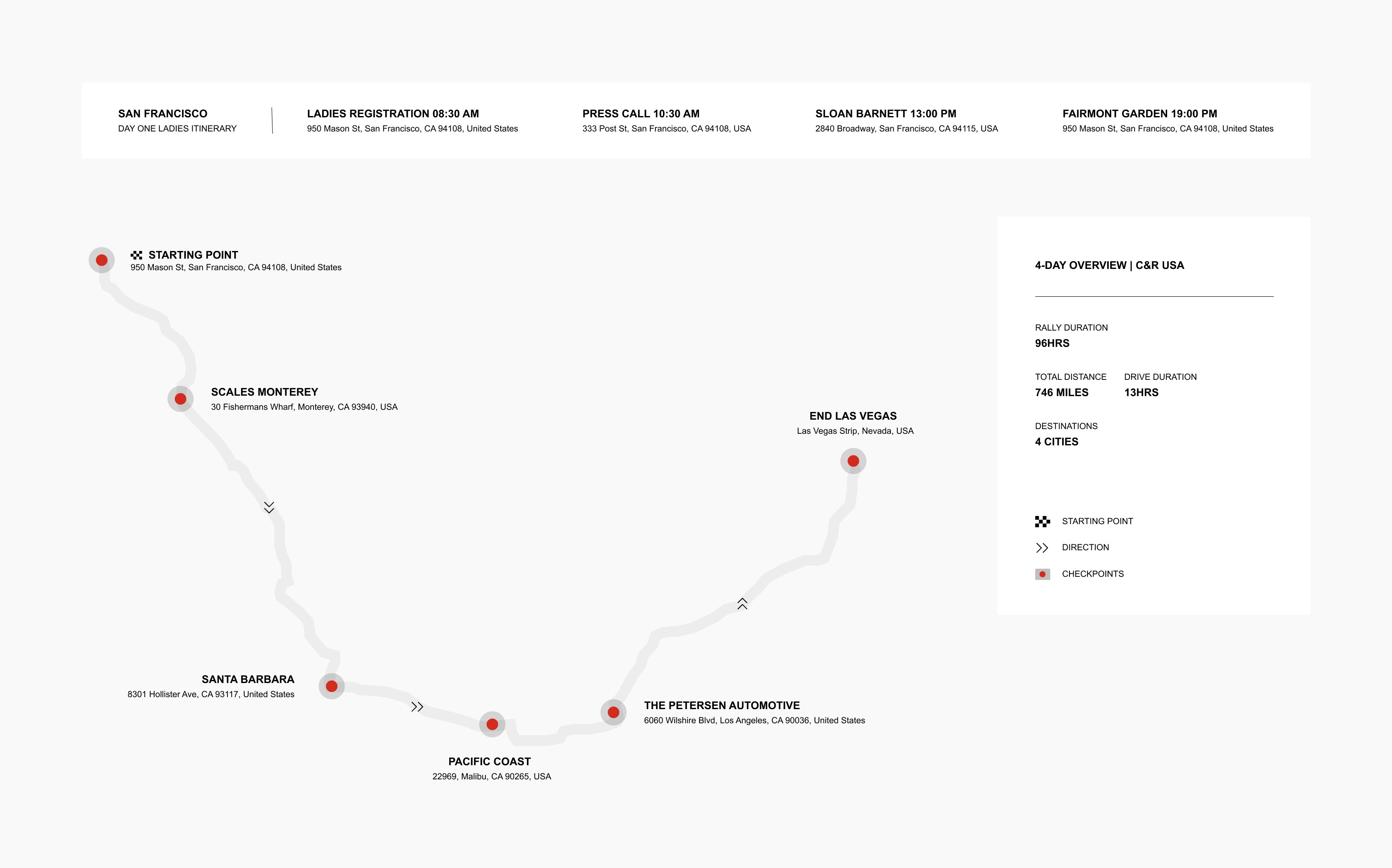 The Car Tour is a four-day physical journey through culture, landscape, and purpose. We designed the full suite of printed and digital collateral that travels with it — from pre-tour itinerary booklets to city-by-city journey guides that read like despatches from somewhere worth going.