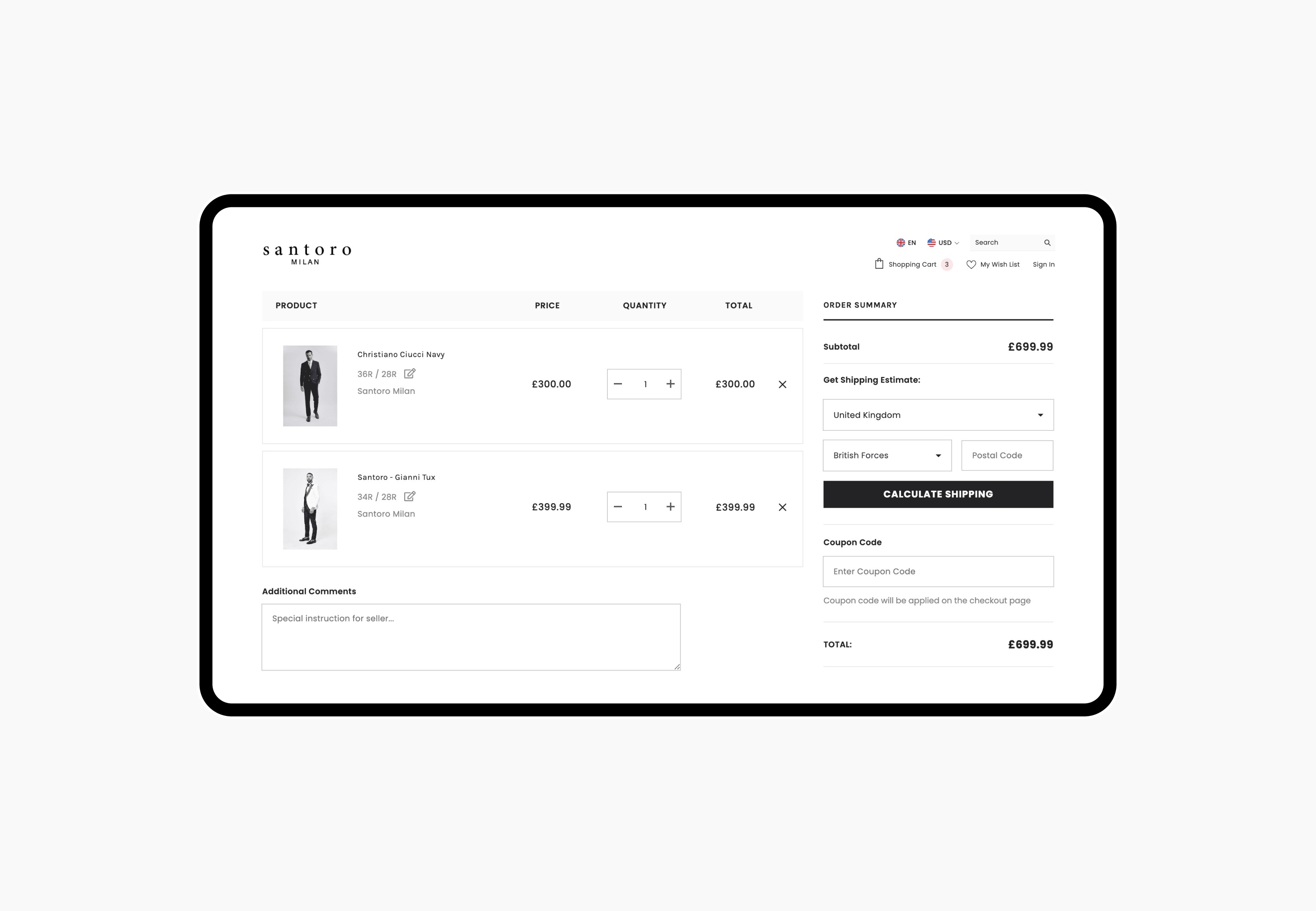 Santoro Milan’s listing page creates a luxury shopping experience with clean, elegant layouts and high-quality imagery, reflecting the brand’s commitment to refinement and sophistication. Advanced filtering options enable customers to easily browse by size, color, fabric, and collection, ensuring effortless product discovery and a seamless selection process.