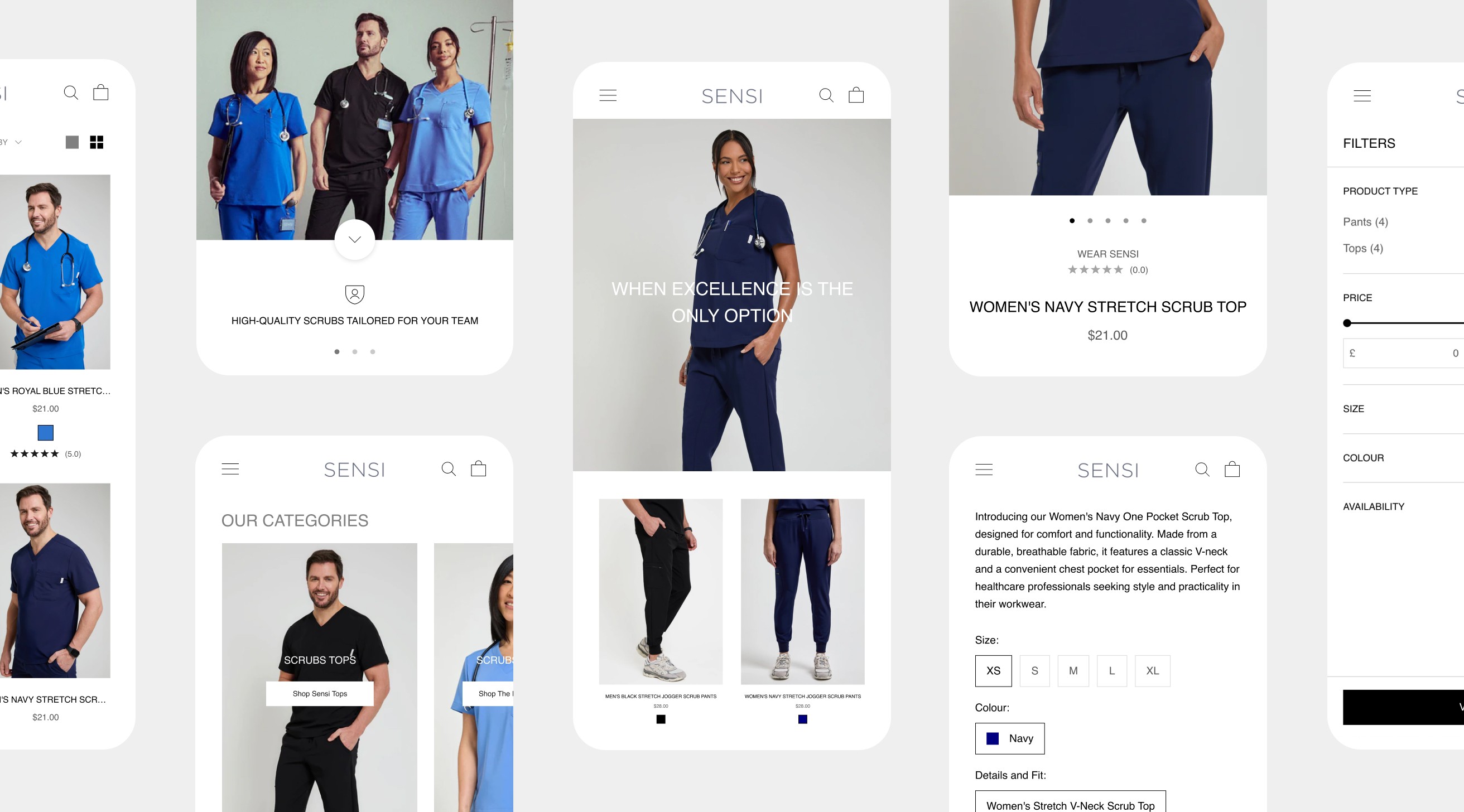 Sensi’s product display pages showcase premium scrubs with high-quality imagery, detailed descriptions, and intuitive filtering, ensuring a seamless browsing experience. Product videos highlight fit, fabric, and functionality, giving customers a closer look at craftsmanship and performance in action.